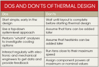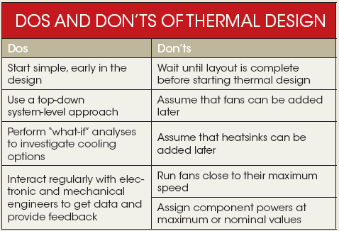 热设计方面有两条基本原则:尽早尽简。由元件结点至环境的热流通路(译注:也称热阻)决定了元件的温度,其中环境通常是指局部环境的空气温度。因此元件温度的控制属于系统设计层面的问题。在产品热设计过程中工程师应采用自上而下的方法来提升产品的可靠性(见下表)。