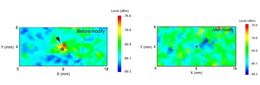 右二图: 由近场EMI扫描测试,可看出芯片电容的制作能有效降低此IC中心处的电磁辐射程度
