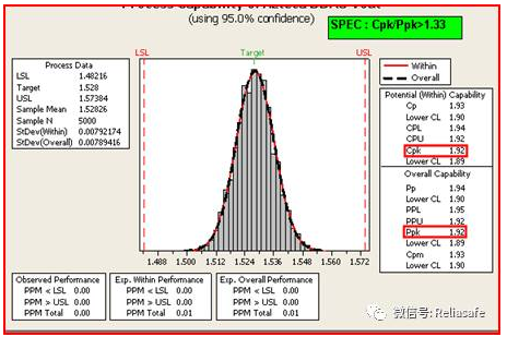 d) 同样利用Minitab计算出这组输出数据的Cpk/Ppk。输出电压为:1.528V+/-3%.