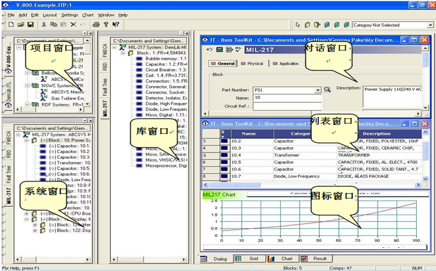 从软件扩展性、易用性以及兼容性方面看,用户有比较大的扩展余地。如元器件库、失效模式库、默认值库等。用户既可以调用标准库,还可以修改添加库的内容,甚至可以自定义库。提供了可视化图形显示处理、可视化报告生成。对于分析报告,Item软件采用的是模板技术,用户可以采用标准模板,也可以对模板进行修改,可以通过自定义模板生成中文的报告。另外,所有报告均可以输出到Word、Excel等应用程序。在软件界面方面,Item采用工业标准Windows界面,尊重操作人员的软件操作习惯,使操作人员只需经过短时间的培训即可顺利操作软件。