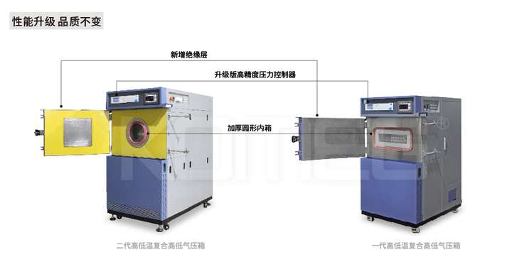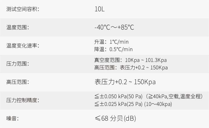 科明高低温复合高低气压箱KU-10L-HP,验证改良后的圆桶型压力内桶,耐压性能更好,更轻薄,温度传热效率高。配合GE压力控制器,达到校准级压力控制精度,精度最高可达整个校准温度范围的0.001%FS,可实现高精度的数据获取。高低温复合高低气压箱多功能,体积小,同时可做高低压力,高低温度等多种试验,满足用户计量级别高精度的检测需求。