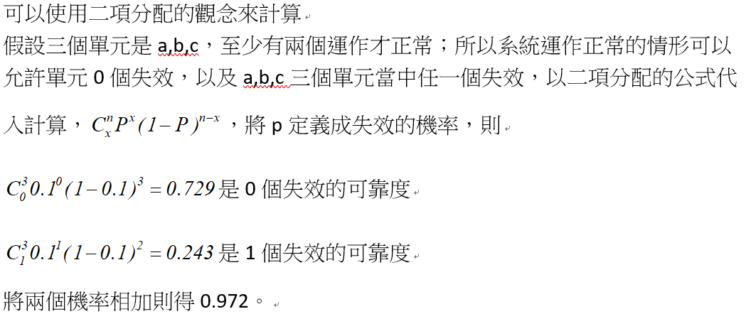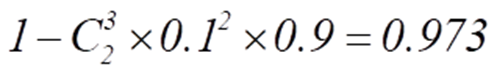个人理解:理解成投票问题 2票同意系统可以通过, 3个两面取两个都是坏的组合数是总共3组, ,工时的后半部分是2个系统都是失效的概率还需要加上一个三个系统都有失效的概率所以成功概率是1-3*0.1*0.1*0.9-1*0.1*0.1*0.1=0.972