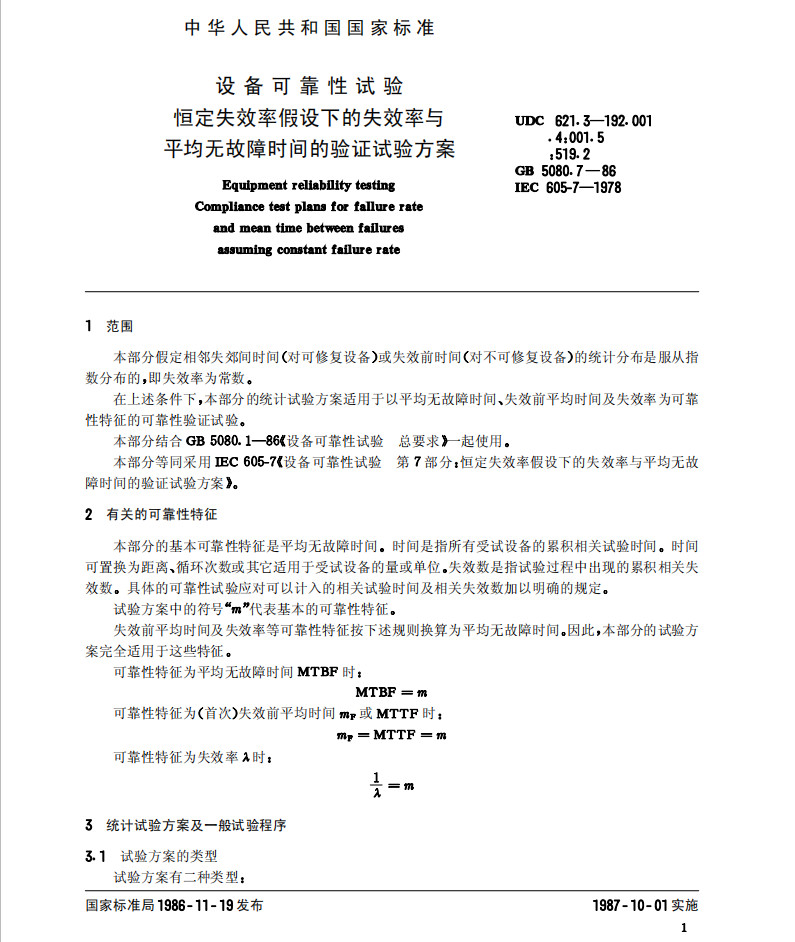 GB-T 5080.7-1986设备可靠性试验恒定失效率假设下的失效率与平均无故障时间的验证试验方案